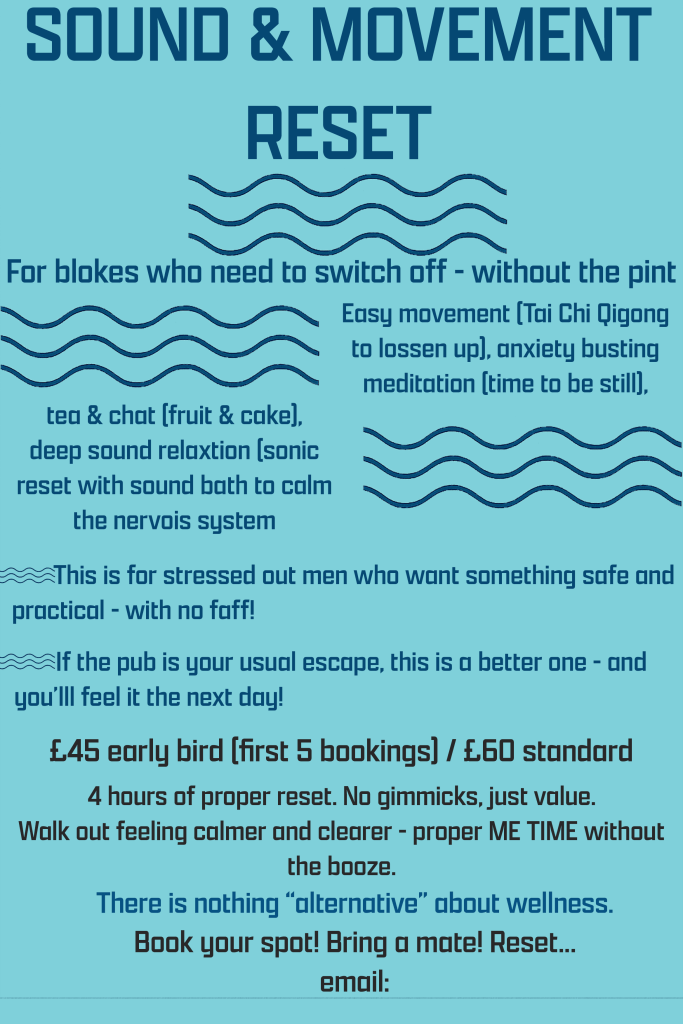 I have teamed up with Waves and Vibrational Energy to host a proper Blokes Reset Workshop – 4 hours designed just for BLOKES who want to switch off, recharge, and feel better moving forward…